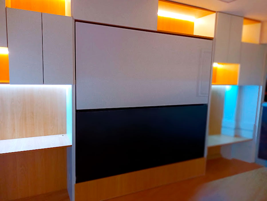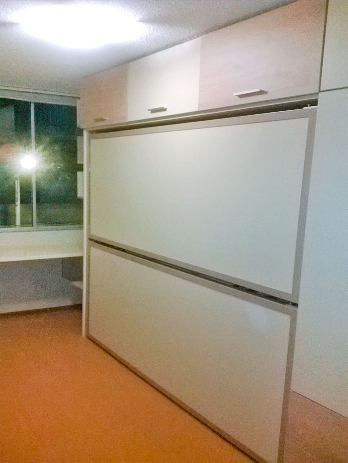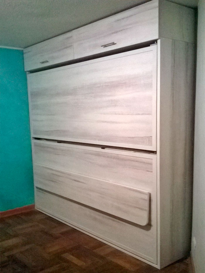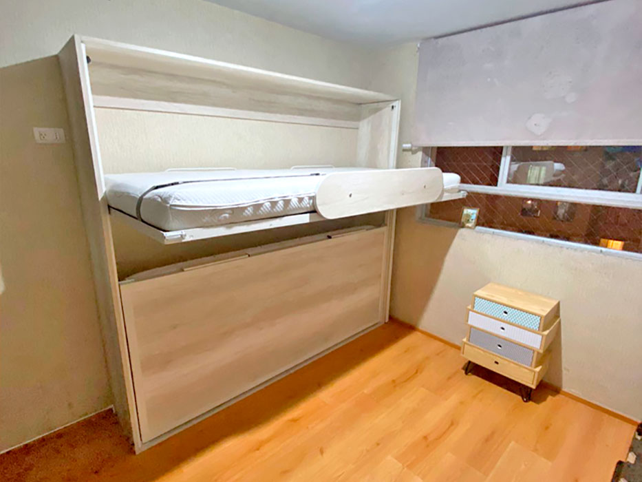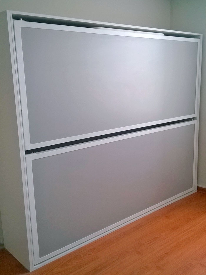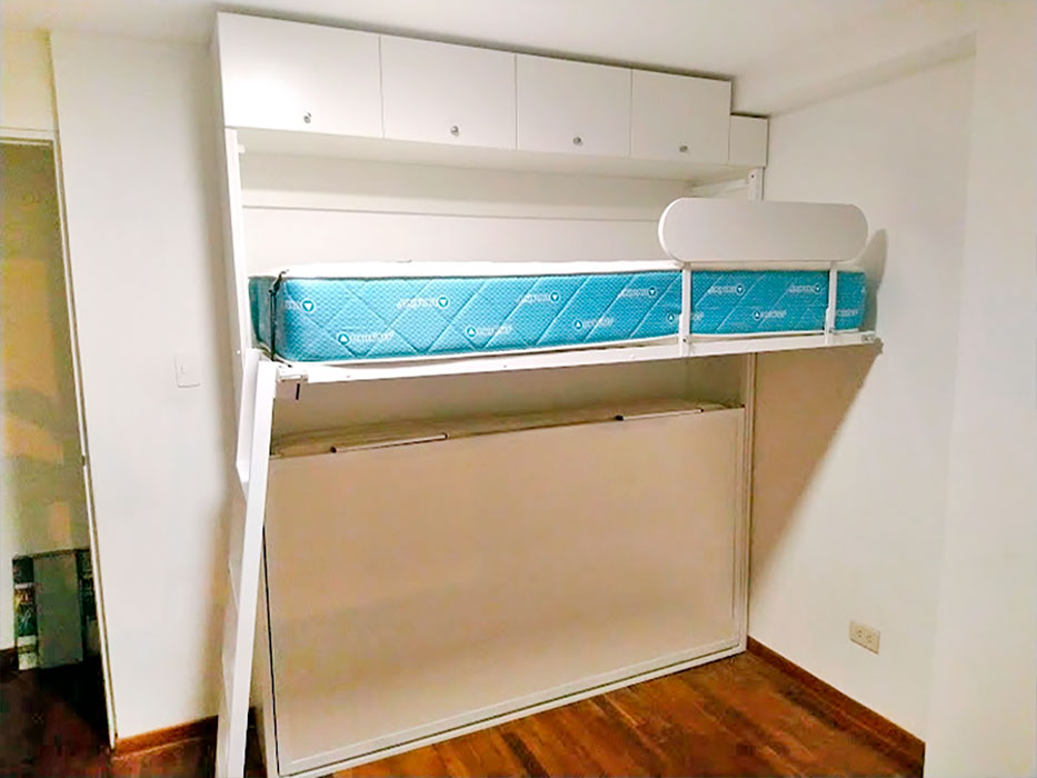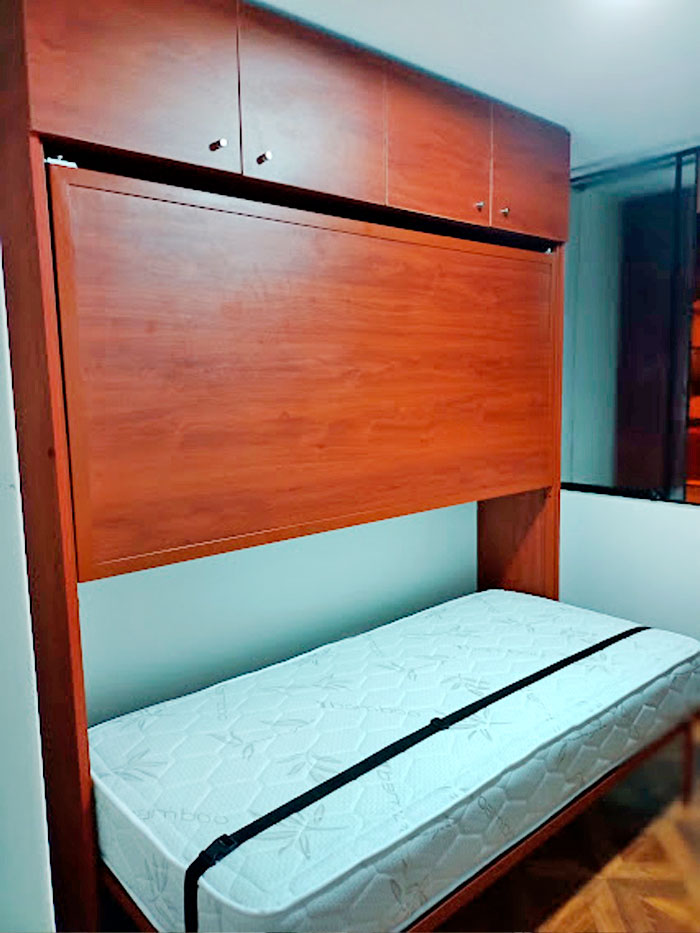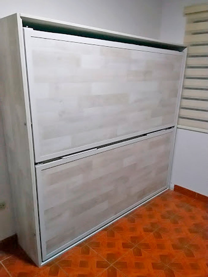 Fabricadas y reforzada con somier interno en estructura de acero negro LAC, sistema mec谩nico pivotante con ejes de acero tratadas con anticorrosivos EPOXICO y acabado con pintura GLOSS acr铆lico, accesorios de aluminio, recubierta totalmente en melamina 19 mm, con doble tablero de melamina, frente e interior de tarima quedando un acabado limpio de estructura met谩lica, incluye escalera con seguro antideslizante, baranda plegable de 80 cm de seguridad nivel superior, transporte, instalaci贸n y anclaje con sistema Hilti pernos de expansi贸n.